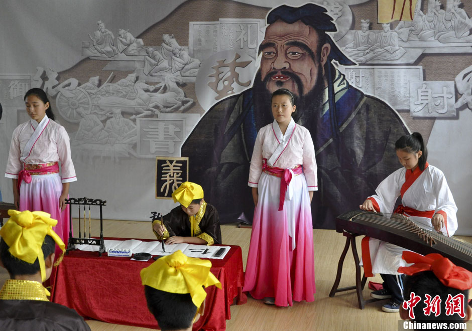 9月27日,济南明湖中学的学生身着汉服诵《论语》,习“六艺”,纪念中国古代伟大的思想家、教育家、哲学家、儒家学派创始人孔子诞辰2564周年。中新社发 张勇 摄