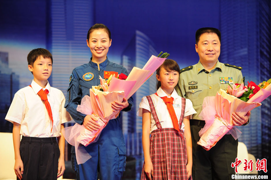 9月27日,中国载人航天工程办公室副主任杨利伟、中国女航天员王亚平来到深圳,在市民中心大礼堂与深圳1500名学生面对面交流。王亚平在航天科普报告会上与同学们分享了航天员的人生经历。中新社发 陈文 摄