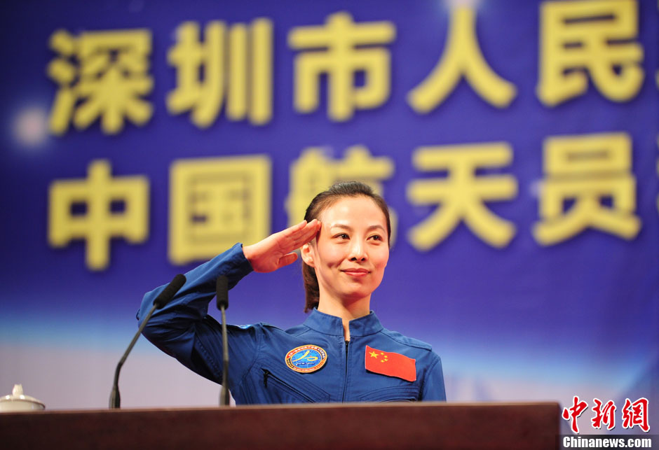 9月27日,中国载人航天工程办公室副主任杨利伟、中国女航天员王亚平来到深圳,在市民中心大礼堂与深圳1500名学生面对面交流。王亚平在航天科普报告会上与同学们分享了航天员的人生经历。中新社发 陈文 摄