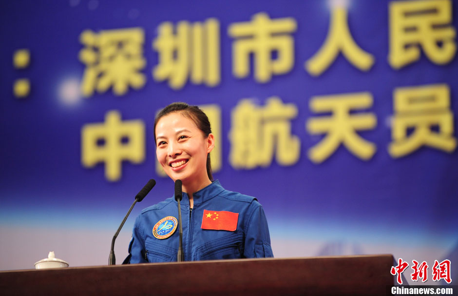 9月27日,中国载人航天工程办公室副主任杨利伟、中国女航天员王亚平来到深圳,在市民中心大礼堂与深圳1500名学生面对面交流。王亚平在航天科普报告会上与同学们分享了航天员的人生经历。中新社发 陈文 摄