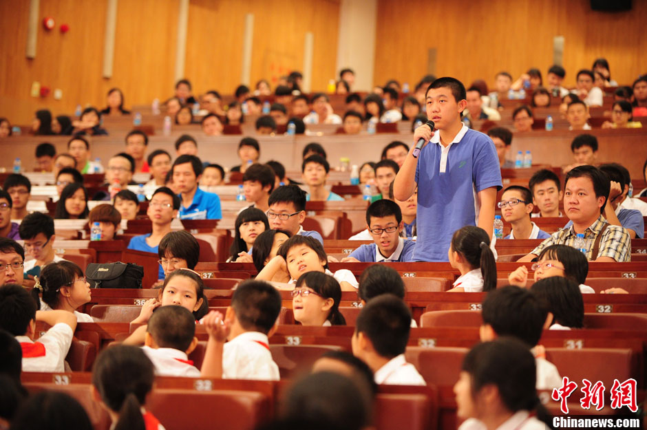 9月27日,中国载人航天工程办公室副主任杨利伟、中国女航天员王亚平来到深圳,在市民中心大礼堂与深圳1500名学生面对面交流。王亚平在航天科普报告会上与同学们分享了航天员的人生经历。中新社发 陈文 摄