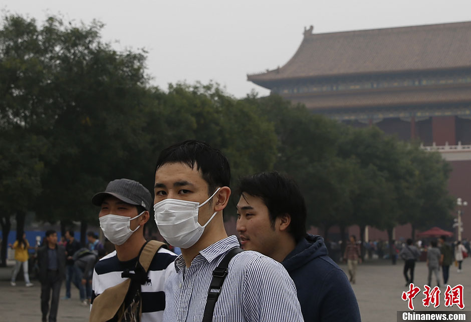 9月29日,游客佩戴口罩游览北京故宫。当日,北京市发布霾黄色预警。中新社发 刘关关 摄