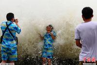 9月30日,受台风“蝴蝶”影响,海南省三亚市三亚湾海边狂风大作,巨浪滔天。巨大的海浪也吸引了一些游客来到海边看海。中新社发 骆云飞 摄