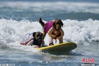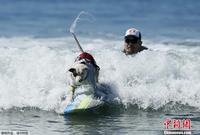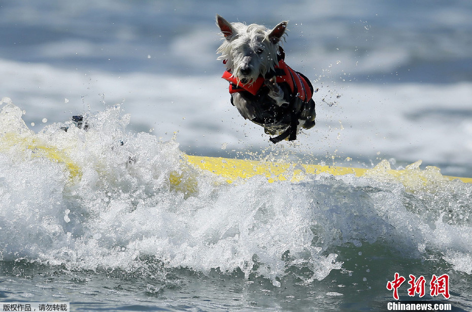 9月29日,美国杭廷顿海滩,第5届狗狗冲浪比赛举行,汪星人上演水上大PK。