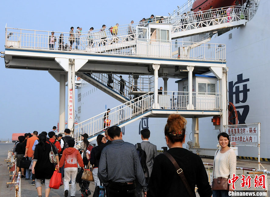 9月30日,大量旅客乘坐渤海轮渡客船从烟台去大连,渤海湾客滚运输迎来高峰期。随着“十一”黄金周到来,学生流、旅游流、探亲流汇集渤海湾烟台至大连航线,渤海轮渡公司共投入9艘大型客滚船,每天可运送旅客2万多人次,运送车辆3000多辆次。图为旅客排队登船。中新社发 王建波 摄