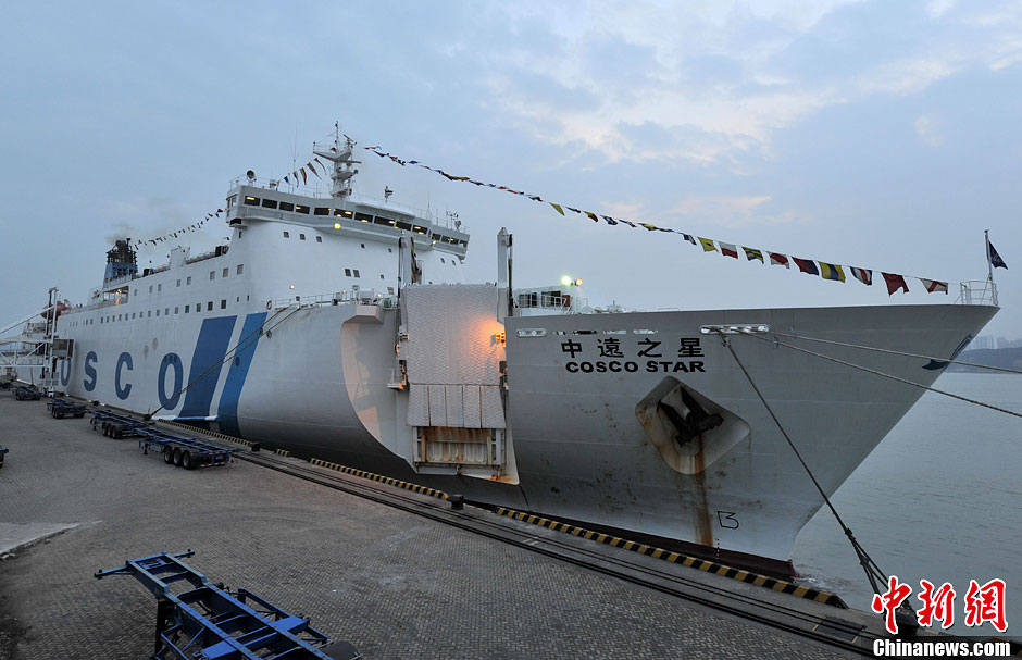 9月30日,搭载着119名旅客和45个标准集装箱,“中远之星”号于当日晚上6点驶离厦门国际邮轮中心,开往高雄。这也标志高雄开通首个和大陆连接的海上常态化客运定期班轮航线。 据介绍,“中远之星”将在每周一晚上6点从厦门出发,周二上午9点左右到达高雄,实现“朝发夕至”。图为准备出发的“中远之星”号。中新社发 吕明 摄