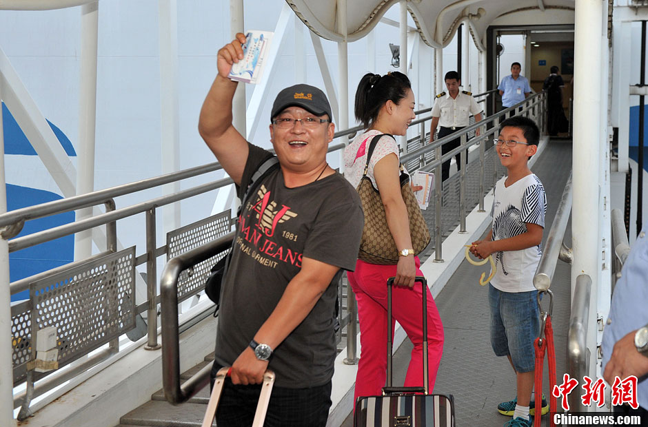 9月30日,搭载着119名旅客和45个标准集装箱,“中远之星”号于当日晚上6点驶离厦门国际邮轮中心,开往高雄。这也标志高雄开通首个和大陆连接的海上常态化客运定期班轮航线。 据介绍,“中远之星”将在每周一晚上6点从厦门出发,周二上午9点左右到达高雄,实现“朝发夕至”。图为游客检票入船。中新社发 吕明 摄
