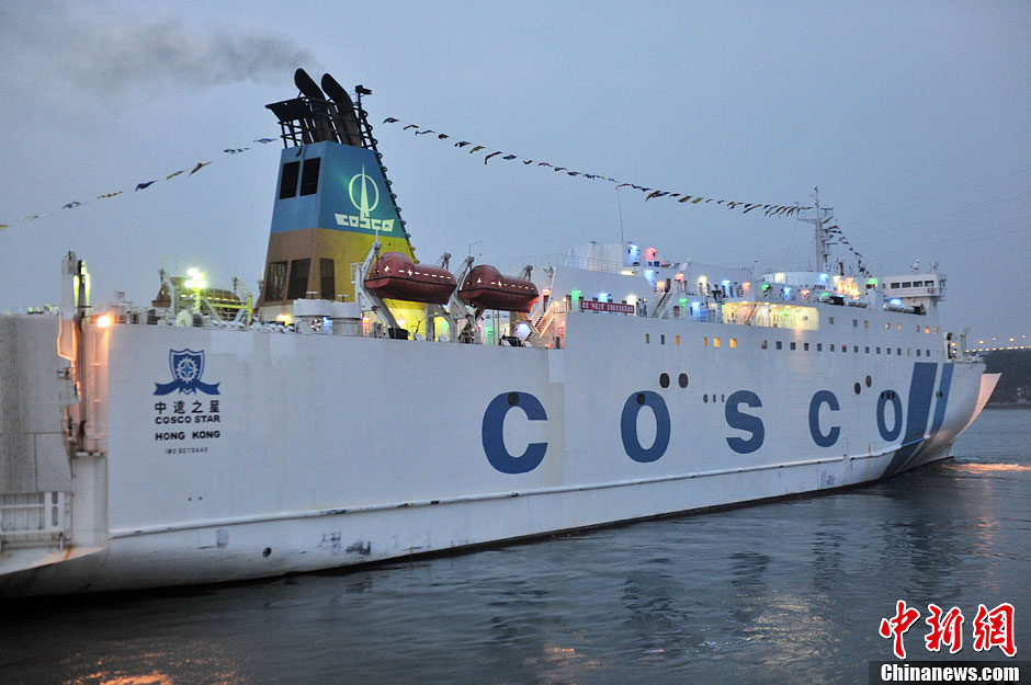 9月30日,搭载着119名旅客和45个标准集装箱,“中远之星”号于当日晚上6点驶离厦门国际邮轮中心,开往高雄。这也标志高雄开通首个和大陆连接的海上常态化客运定期班轮航线。 据介绍,“中远之星”将在每周一晚上6点从厦门出发,周二上午9点左右到达高雄,实现“朝发夕至”。中新社发 吕明 摄