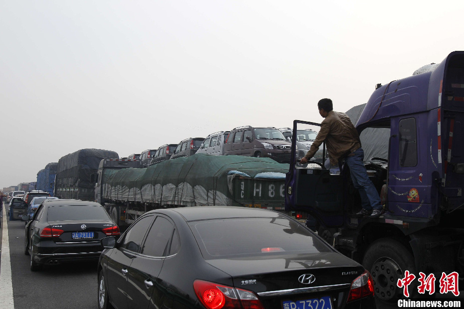 10月1日,国庆放假首日,大广高速安阳段北京方向,一大早即开始再现大堵车,滚滚车流望不到尽头,一时成了停车场。中新社发 王中举 摄