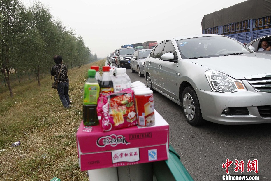 10月1日,国庆放假首日,大广高速一大早即开始再现大堵车,滚滚车流望不到尽头,数个小时难以突围,高速路一时变成停车场,小贩们也不失时机的来到拥堵的车流中寻觅商机。中新社发 王中举 摄