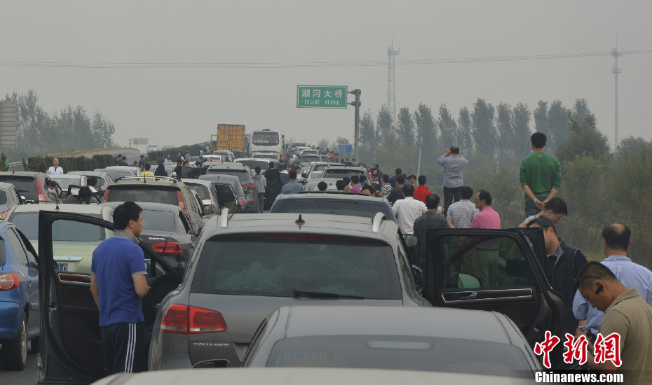 10月1日,刚刚迎来“国庆”假期的旅客被“堵”在高速公路上。图为荣乌高速山东沾化路段出现拥堵,部分司机和乘客下车观望。中新社发 丁栋 摄
