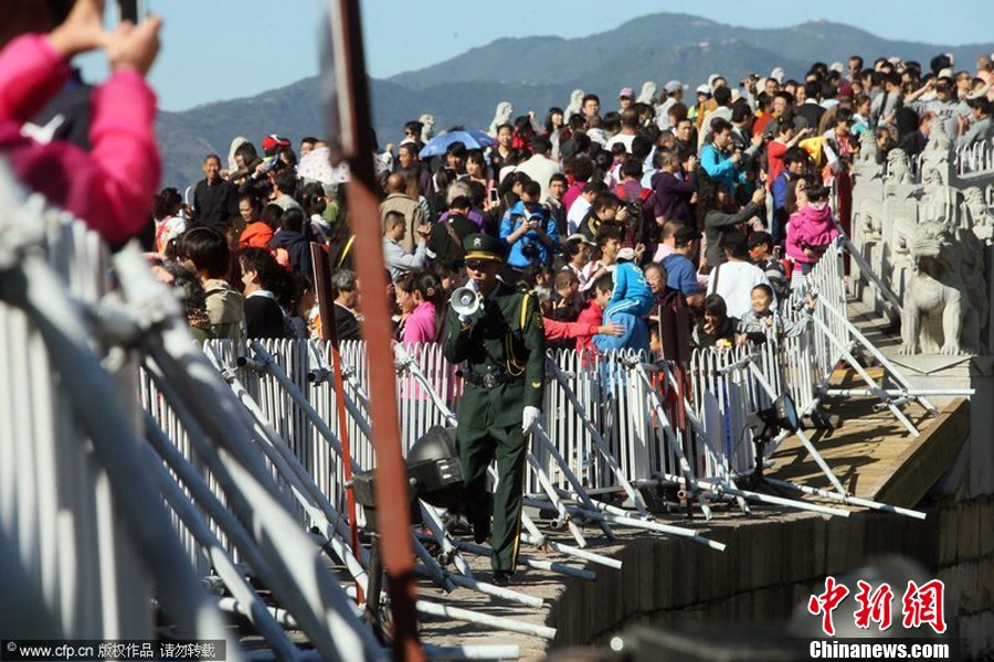 2013年10月2日,国庆黄金周第二天是景区接待游人高峰。北京市假日办数据分析,预计上午9点到下午2点为入景区高峰,故宫、颐和园等景区今天游客量大。图为2013年10月02日,北京,大批游客来到颐和园参观游览,争相和大黄鸭拍照留念。付丁 摄 图片来源:CFP视觉中国