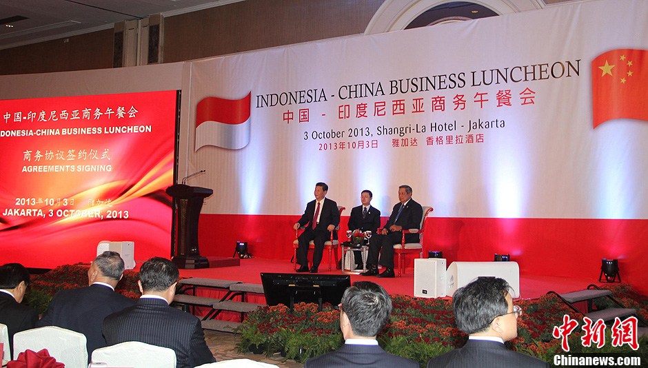 10月3日,中国国家主席习近平和印尼总统苏西洛在雅加达共同出席中国-印尼商务午餐会,并见证中印尼两国企业家签署逾200亿美元的投资合作协议。中新社发 顾时宏 摄
