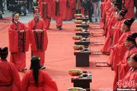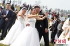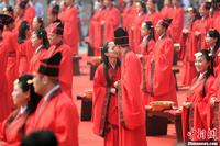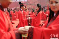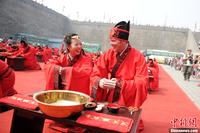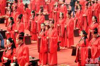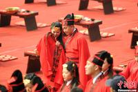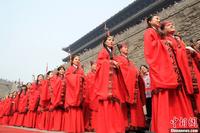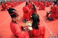 10月4日,在西安城墙北门瓮城内,来自中国各地的103对新人身着汉服,举行了一场浩大的集体汉式婚礼。张远 摄