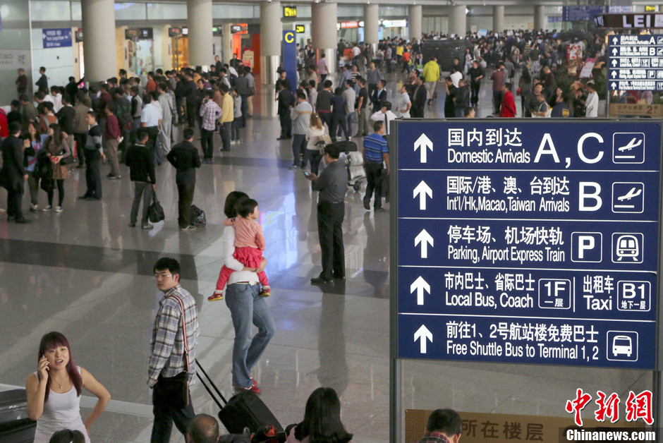 10月6日,北京首都机场3号航站楼的到达大厅内旅客众多。“十一”黄金周的第六天,外出游玩或探亲的旅客踏上返程,返京的客流呈增长态势。中新社发 李慧思 摄