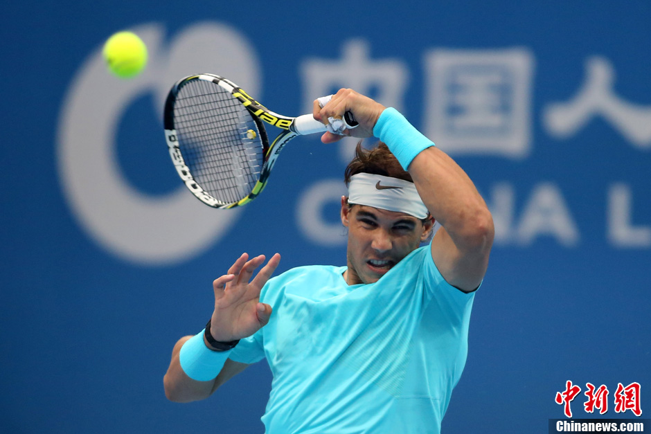 10月6日,纳达尔在比赛中回球。当日,在2013中国网球公开赛男单决赛中,塞尔维亚选手德约科维奇以2比0战胜西班牙选手纳达尔,第四次夺得中网冠军。中新社发 韩海丹 摄