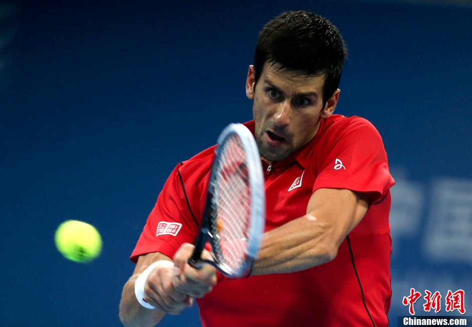 10月6日,在2013中国网球公开赛男单决赛中,塞尔维亚选手德约科维奇以2比0战胜西班牙选手纳达尔,第四次夺得中网冠军。中新社发 刘关关 摄