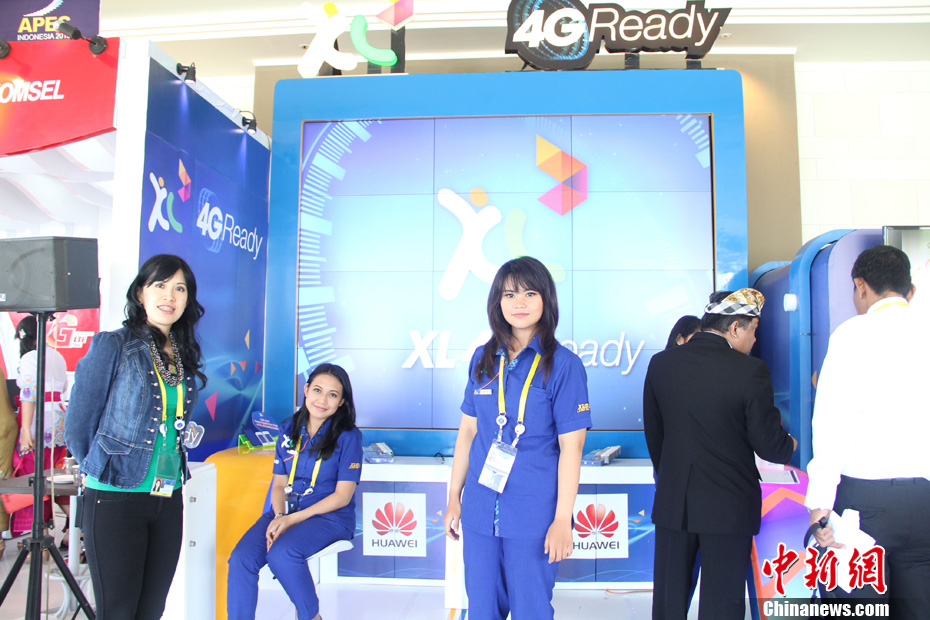 10月7日,亚太经合组织(APEC)领导人第21次非正式会议在印尼巴厘岛举行。会议举办前,印尼当地主流运营商与中国企业华为一起实现了巴厘岛3G移动信号覆盖优化,并在APEC会场区域和机场实现4G移动信号覆盖,提供更快宽带接入,保障了此次APEC会议的通讯需求。图为会场门口给与会嘉宾提供服务的唯一一家中国企业华为的展台。 顾时宏 摄