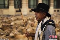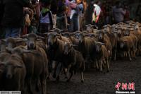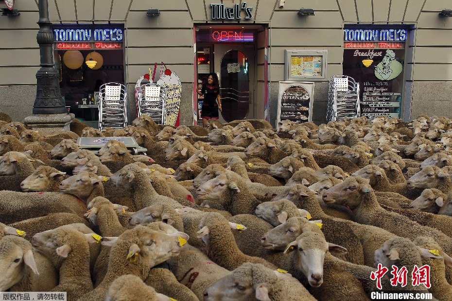 当地时间2013年10月6日,西班牙马德里一牧羊人赶着羊群穿过市中心大街,呼吁加强对季节性牲畜迁移古道的保护工作。