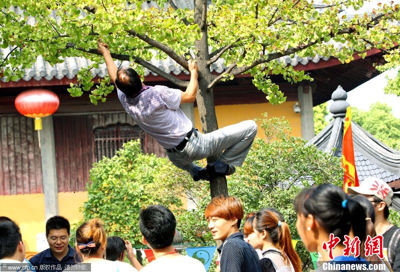 10月1日,一名游客在苏州市玄妙观入口处攀爬上银杏树采摘白果。王建中 摄 图片来源:CFP视觉中国