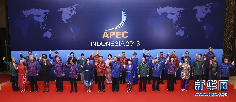 10月7日,国家主席习近平和夫人彭丽媛在印度尼西亚巴厘岛出席印尼总统苏西洛和夫人为出席亚太经合组织第二十一次领导人非正式会议的各成员领导人夫妇举行的欢迎晚宴。这是晚宴前,习近平和夫人彭丽媛与各成员领导人夫妇集体合影。新华社记者 马占成 摄 图片来源:新华网