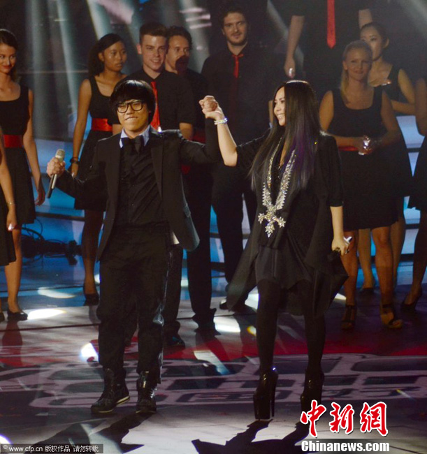 2013年10月07日讯,上海,7日,《中国好声音》第二季总决赛。李琦、张恒远、萱萱、金润吉火力全开。经过三轮的比拼和较量,继续实验之旅的金润吉在演唱一首小清新的《遇见》后,首轮遭到淘汰。在终极对决中,“蘑菇头”李琦战胜张恒远,赢得观众支持率和媒体投票的“双高”,如愿获得年度总冠军,“新人”张惠妹也随之成为新科冠军导师,激动上台拥抱爱徒。钟福宝 摄 图片来源:CFP视觉中国