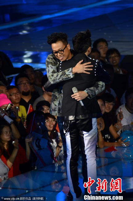 2013年10月07日讯,上海,7日,《中国好声音》第二季总决赛。李琦、张恒远、萱萱、金润吉火力全开。经过三轮的比拼和较量,继续实验之旅的金润吉在演唱一首小清新的《遇见》后,首轮遭到淘汰。在终极对决中,“蘑菇头”李琦战胜张恒远,赢得观众支持率和媒体投票的“双高”,如愿获得年度总冠军,“新人”张惠妹也随之成为新科冠军导师,激动上台拥抱爱徒。钟福宝 摄 图片来源:CFP视觉中国