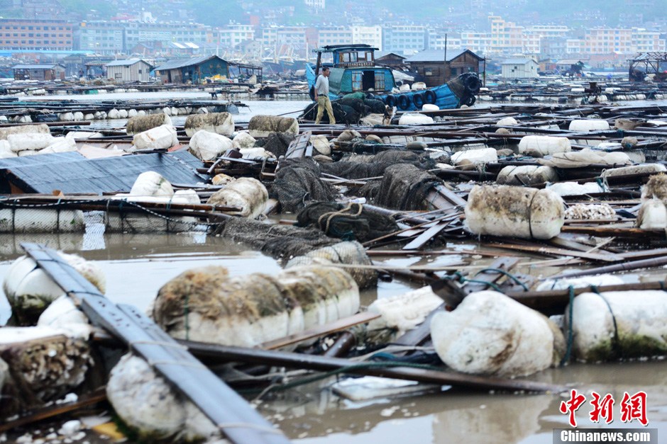 10月7日,福鼎市沙埕镇成片的海上养殖场被台风“菲特”摧毁,渔民损失惨重。当日凌晨1点15分,今年第二十三号台风“菲特”在福建省福鼎市沿海登陆,登陆时中心附近最大风力十四级。中新社发 张斌 摄
