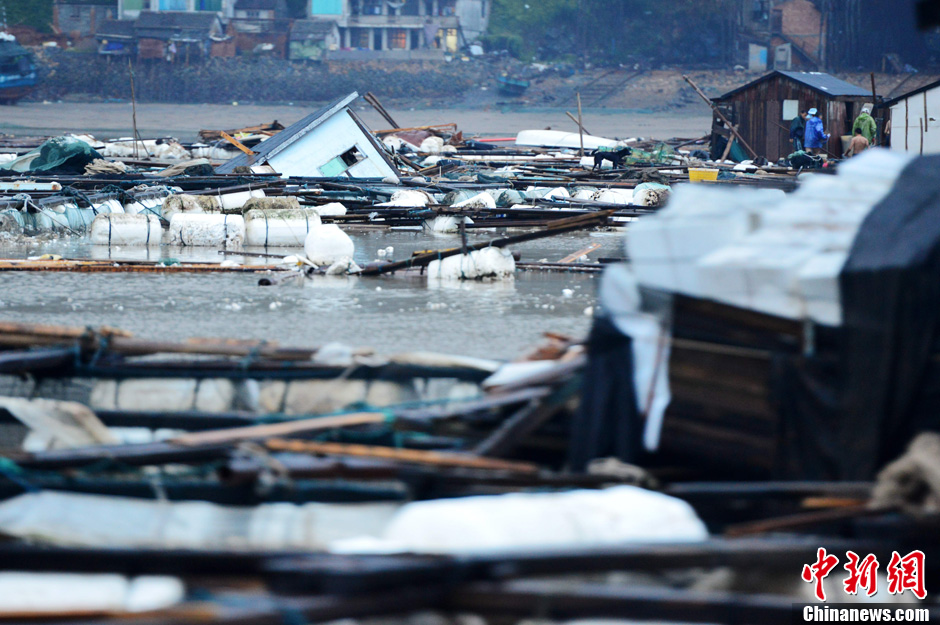 10月7日,今年第23号强台风“菲特”在福建省福鼎市登陆,造成福建逾19亿元人民币的损失,但尚无人员伤亡的报告。据福建省防汛办7日披露,截至当天10时初步统计,福建有4个设区市(含平潭)、12个县(市、区)、20.54万人受灾,紧急转移17.69万人,房屋倒塌100间,农作物受灾6.27千公顷,损坏堤防8.32千米,直接经济总损失19.06亿元。图为10月7日,福鼎市沙埕镇成片的海上养殖场被台风“菲特”摧毁,渔民损失惨重。中新社发 张斌 摄