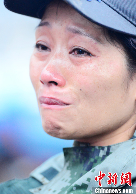 10月7日,福鼎市沙埕镇渔民周小萍双眼含泪,强台风“菲特”让她的渔排受损严重,几乎全军覆没。当日凌晨1点15分,今年第二十三号台风“菲特”在福建省福鼎市沿海登陆,登录时中心附近最大风力十四级。中新社发 张斌 摄