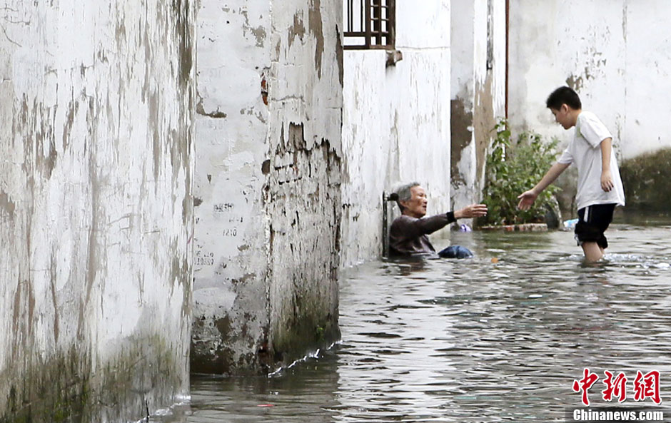 10月7日,浙江台州黄岩区一巷子中积水严重,一位老人不小心跌倒在水中,途经的路人扶她走出积水区。当天,受台风“菲特”影响,当地出现暴雨天气,多处道路积水严重,老人跌倒水中,后在路人帮助下获救。中新社发 郏静妮 摄
