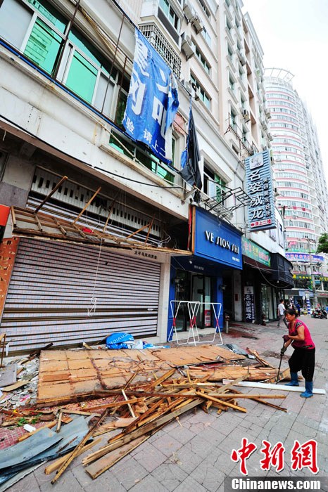 10月7日凌晨1点15分,今年第二十三号强台风“菲特”在福建省福鼎市沙埕镇沿海登陆。福鼎市经过一夜暴风雨的肆虐,福鼎街头一片狼藉,不少道路两旁行道树被连根拨起,街道两旁广告牌被大风吹得支离破碎。由于登陆时中心附近最大风力十四级,台风“菲特”也让福鼎的农作物和海上渔排养殖受损严重。图为10月7日,福鼎市区商家正在清理被台风“菲特”吹毁的灯箱广告牌。张斌 摄