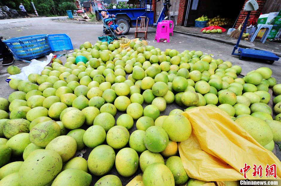 10月7日凌晨1点15分,今年第二十三号强台风“菲特”在福建省福鼎市沙埕镇沿海登陆。图为10月7日,台风“菲特”让福鼎市前岐镇大岳村村民的柚子林损失惨重,不少还未完全成熟的柚子被打落,村民只能挑拣一些成熟的果子“贱卖”。张斌 摄