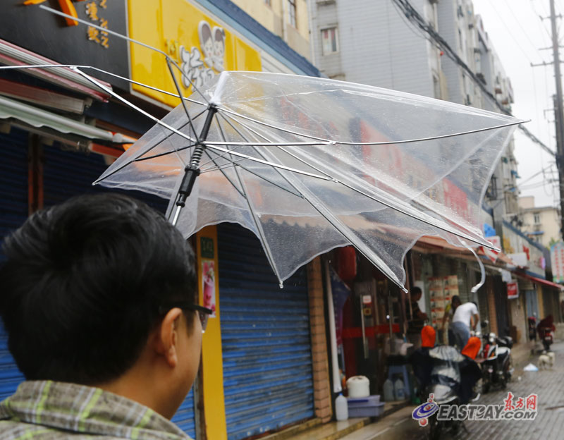 从10月7日晚开始,上海受台风“菲特”影响,遭遇暴雨天气。国庆假期后的首个工作日,市区多条道路出现积水,杨浦、黄浦、普陀等区部分小区和居民家中积水。在普陀区宜川地区,多条路面、沿街商铺和居民家中积水。图为大风瞬间吹翻行人的雨伞。图片来源:东方网