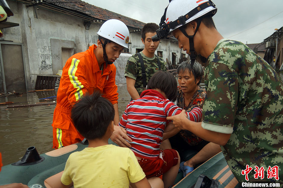 由于第23号台风“菲特”风力强,雨量大,又正逢天文大潮,浙江省宁波市河网水位不断上升,大部分水库蓄水超警戒水位,上游来水迅猛,导致全市11个县(市)区、119个乡镇不同程度受灾。8日凌晨6点,宁波市委市政府紧急部署防汛工作,并决定启动Ⅰ级应急响应,进入“紧急防汛期”。图为消防官兵奋战一线,紧急救援被困民众。何蒋勇 摄