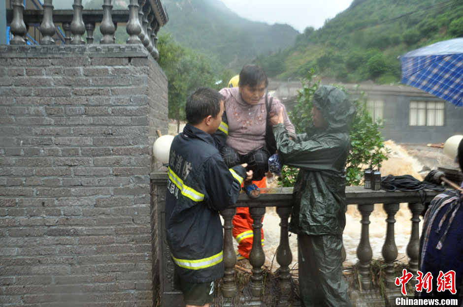 由于第23号台风“菲特”风力强,雨量大,又正逢天文大潮,浙江省宁波市河网水位不断上升,大部分水库蓄水超警戒水位,上游来水迅猛,导致全市11个县(市)区、119个乡镇不同程度受灾。8日凌晨6点,宁波市委市政府紧急部署防汛工作,并决定启动Ⅰ级应急响应,进入“紧急防汛期”。图为消防官兵奋战一线,紧急救援被困民众。何蒋勇 摄