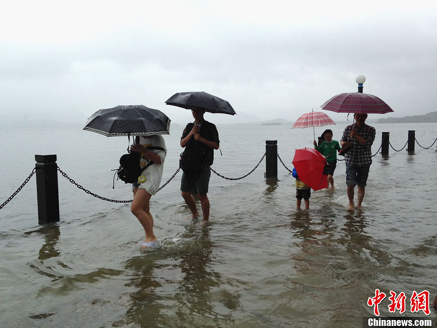 10月8日,游客在杭州西湖边拍照嬉戏。受台风“菲特”影响,浙江杭州自7日凌晨开始持续降雨,西湖水位上涨,出现罕见的水满现象。8日,沿湖多地段湖水外溢,水深达30厘米左右,不少市民游客前往观赏。中新社发 邵思翊 摄