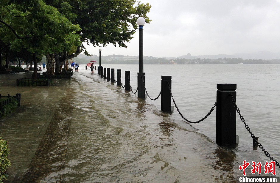 10月8日,沿湖多地段湖水外溢,水深达30厘米左右。受台风"菲特"影响,浙江杭州自7日凌晨开始持续降雨,西湖水位上涨,出现罕见的水满现象。中新社发 邵思翊 摄