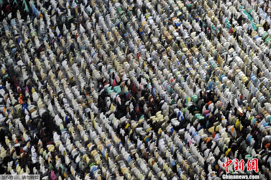 当地时间2013年10月8日,沙特麦加,大批穆斯林聚集在麦加大清真寺进行晚祷。据悉,今年有超过两百万穆斯林来到麦加朝觐。麦加大清真寺是世界著名的清真大寺,伊斯兰教第一大圣寺,世界各国穆斯林向往的地方和去麦加朝觐礼拜的圣地。