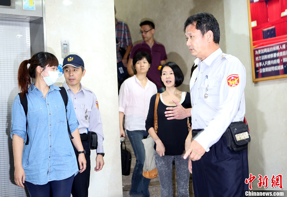 台湾当红艺人(右2)小S(徐熙娣)11日上午为“老公”许雅钧投资的胖达人手感烘焙面包诈欺及内线交易案,被检方传唤到台北地检署作证,经过约1小时左右的侦讯后离去,吸引大批媒体记者在场拥挤采访。陈立宇 摄