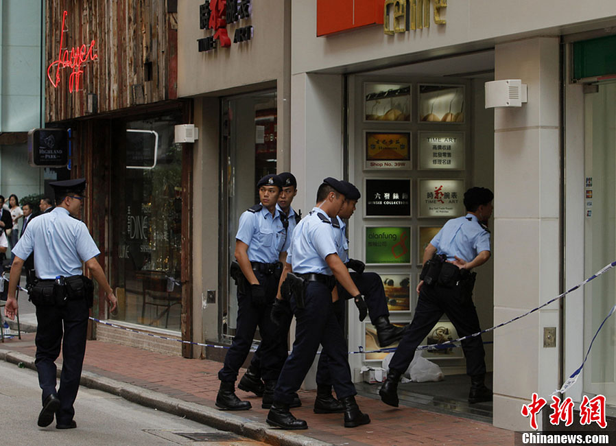 10月11日,香港尖沙咀河内道珠宝店遭劫。150颗钻石被抢,损失一千万港元。尖沙咀河内道十八号一间珠宝店,中午前遭两名贼人行劫,损失150颗原粒钻石(价值约一千万港元)。警方表示,两名男匪徒约一点七米高,身穿深色衣服、修路工人的背心反光衣、头戴黄色工业安全帽、手戴劳工手套,其中一人手持盛有火水或松节油的水桶,泼向五名店员,然后用铁笔撬开饰柜抢劫,另一人就用疑似手枪指吓职员。警方指,行劫过程历时约一分钟,作案快速,相信有一定计划,匪徒亦熟悉附近一带,犯案后沿河内道方向逃去,正调查他们的打扮是否为掩人耳目,以及为何当时珠宝店的警钟无响。小强 摄 图片来源:东方IC 版权作品 请勿转载