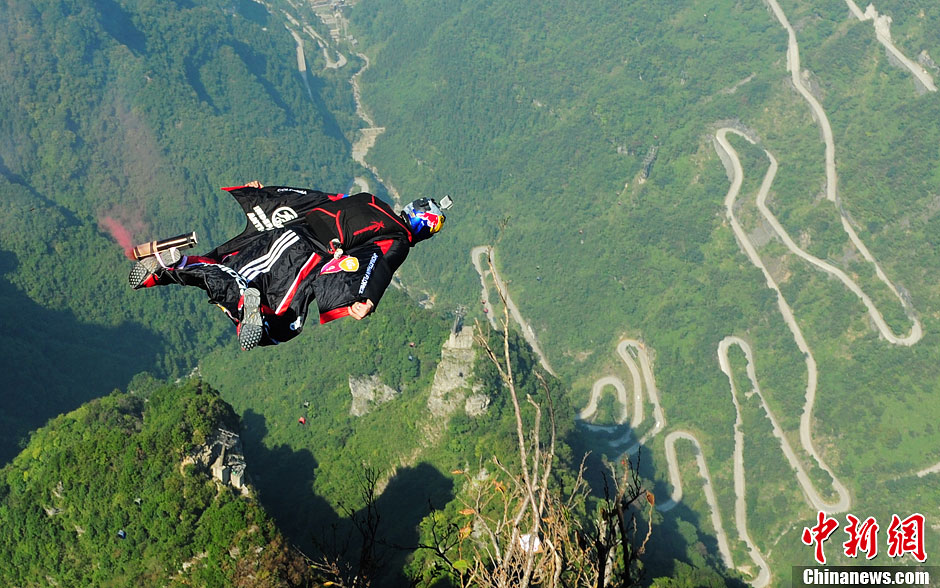 10月12日,第二届翼装飞行世界锦标赛在张家界举行,来自7个国家的14名全球顶尖翼装飞行运动员参加了首日的淘汰赛。中新社发 杨华峰 摄