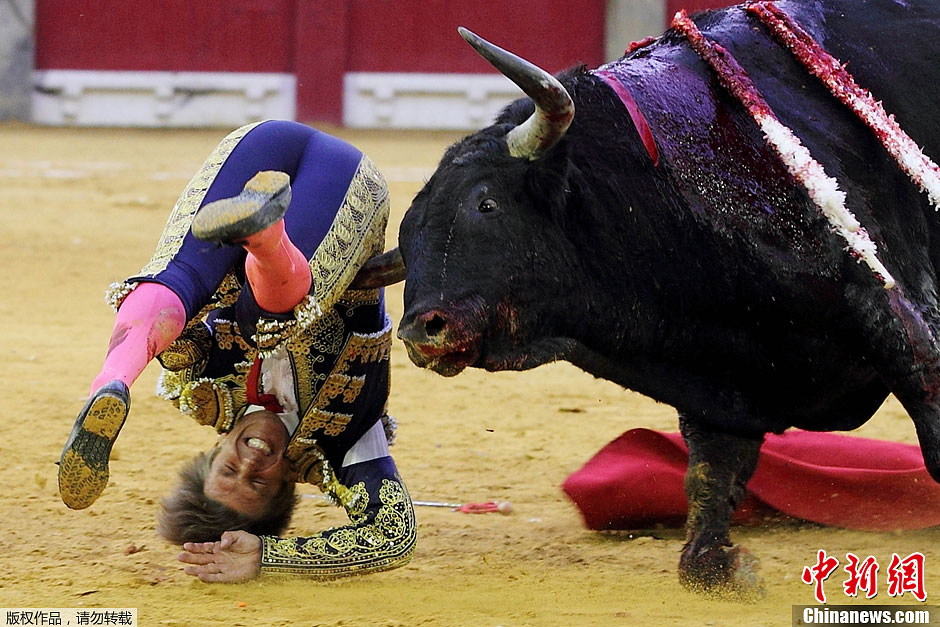 当地时间10月12日,西班牙萨拉戈萨斗牛节自开幕以来进入第五天,斗牛士们在观众面前进行斗牛精彩表演。图为一名斗牛士被公牛顶翻。