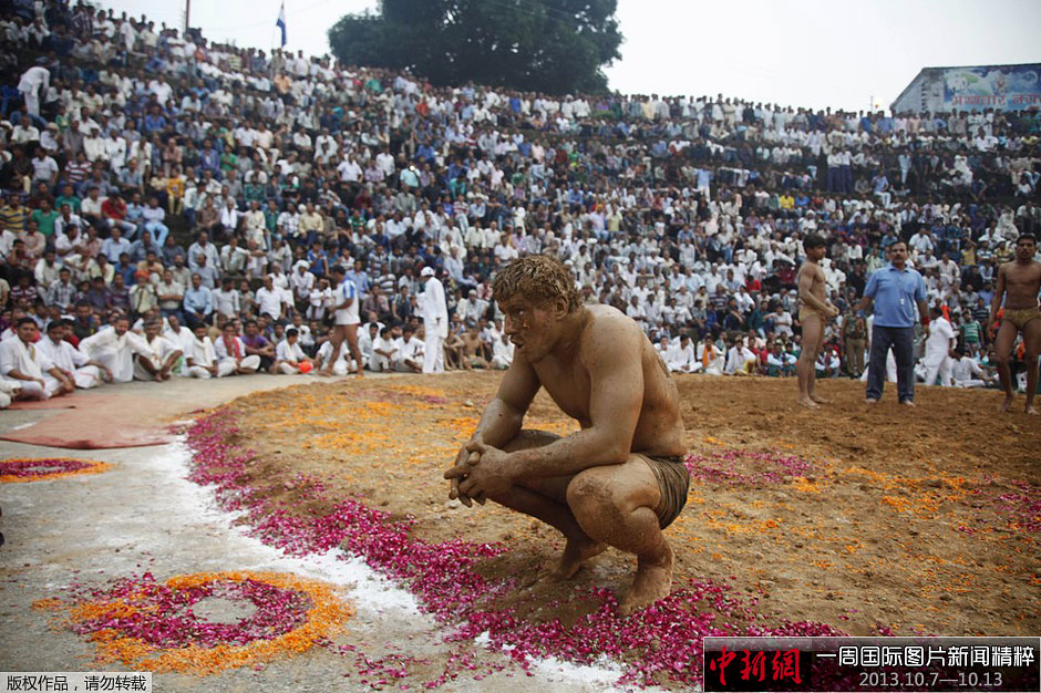 10月10日,在印度Mathwar村举行的年度摔跤锦标赛上,英国选手达森科(Lubchik Dacenko)在战胜印度选手巴卢(Bhalu)后休息。