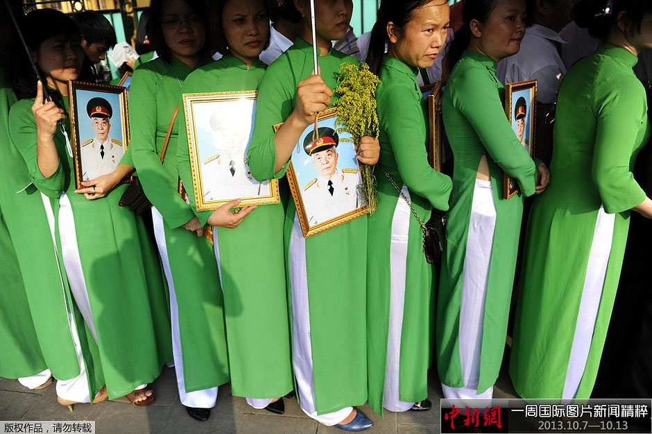 10月10日,越南河内,妇女们抱着大将武元甲(Vo Nguyen Giap)的肖像,排队前往他的住处致哀。武元甲10月4日去世,终年102岁。