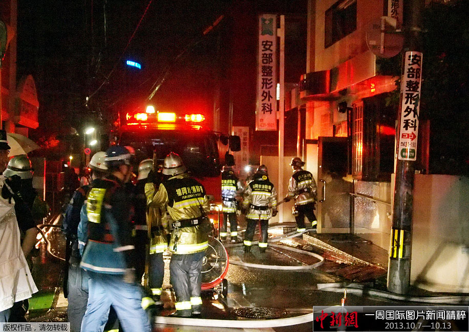 当地时间2013年10月11日,日本福冈,消防员正在灭火。当日日本福冈县一家医院起火,一名警方发言人称,此次事故中已有10人被确认死亡,其中8名病人、两名医院工作人员。
