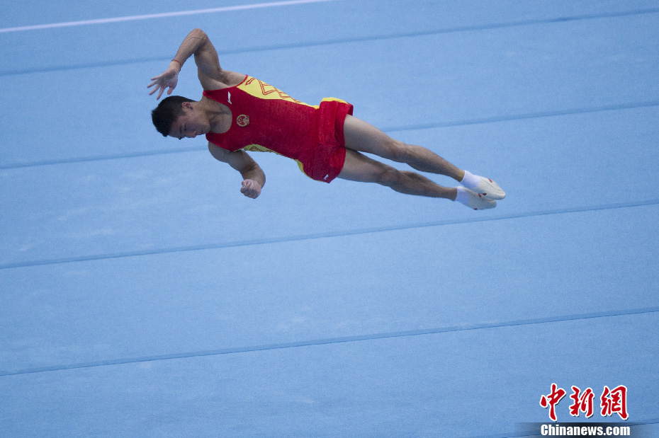 10月13日,中国选手邓书弟在东亚运动会男子自由体操比赛中折桂。图为邓书弟在比赛中。中新社发 崔楠 摄