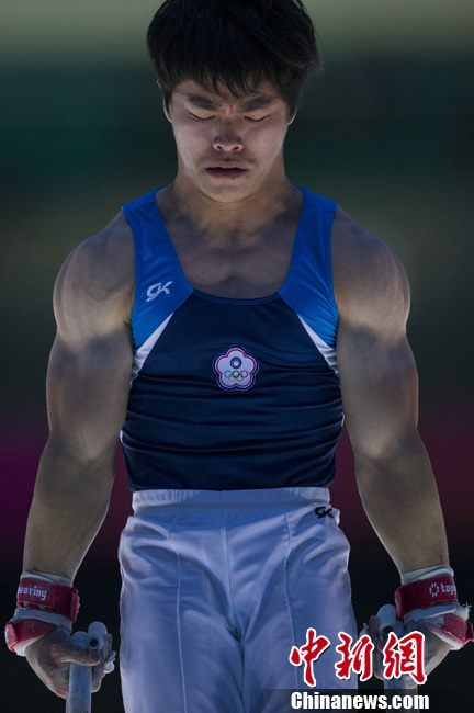 10月13日,中华台北选手陈智郁在吊环比赛中折桂,为中华台北队夺得一枚金牌。图为陈智郁在比赛中。中新社发 崔楠 摄