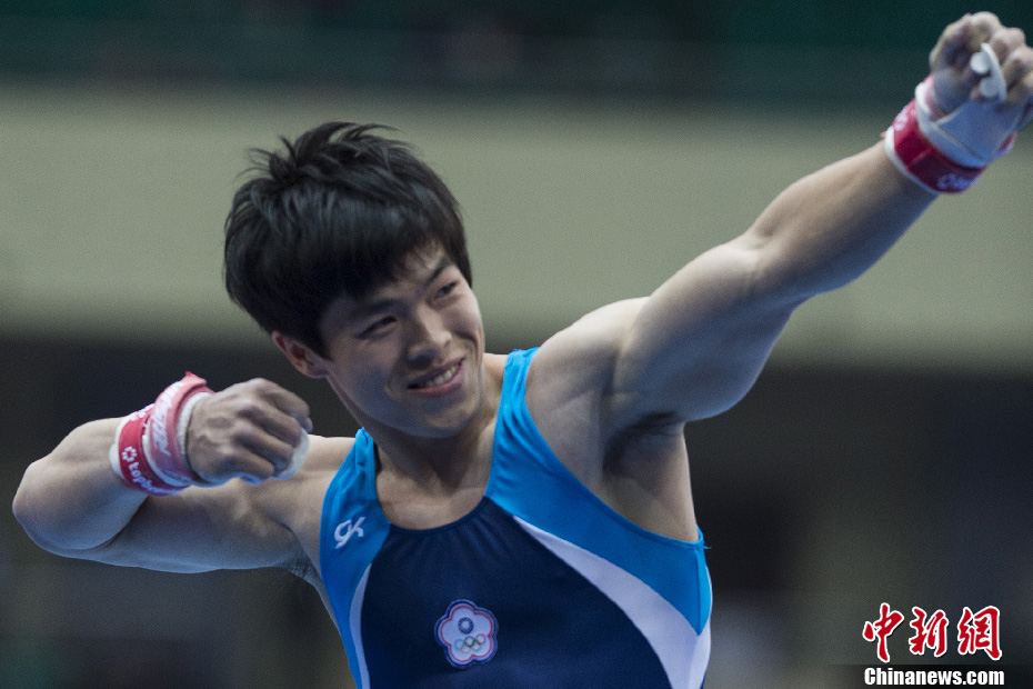 10月13日,中华台北选手陈智郁在吊环比赛中折桂,为中华台北队夺得一枚金牌。图为陈智郁在比赛中。中新社发 崔楠 摄