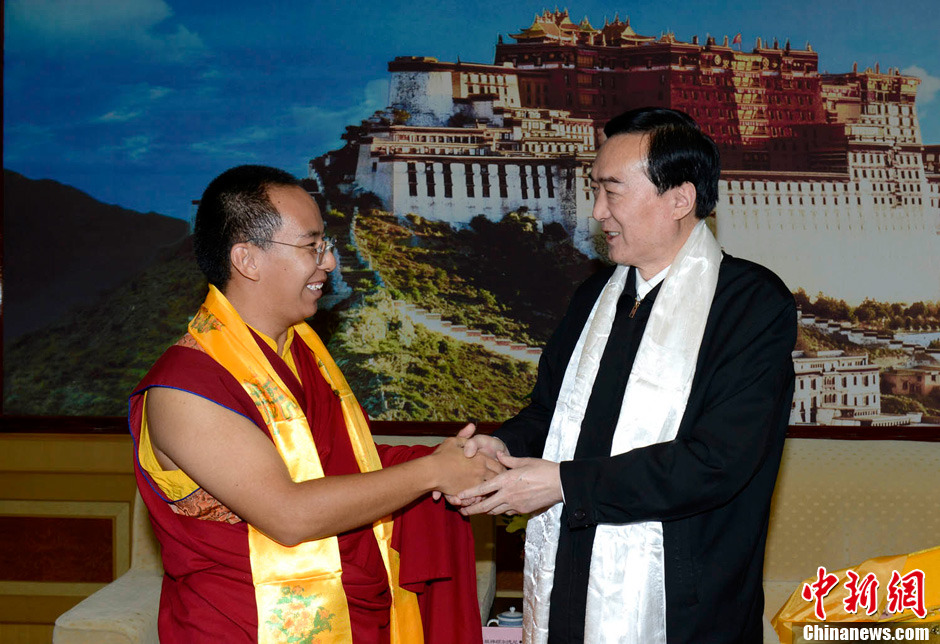 图为8月28日,中共西藏自治区委员会书记陈全国(右)在拉萨会见了班禅额尔德尼·确吉杰布(左)。李林 摄